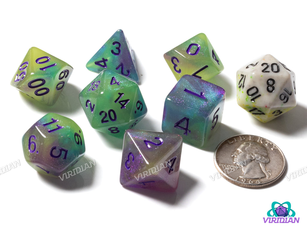 Mystic Aurora (Glow in the Dark) | Light Purple & Neon Yellow-Green Swirls | Acrylic Dice Set (7)