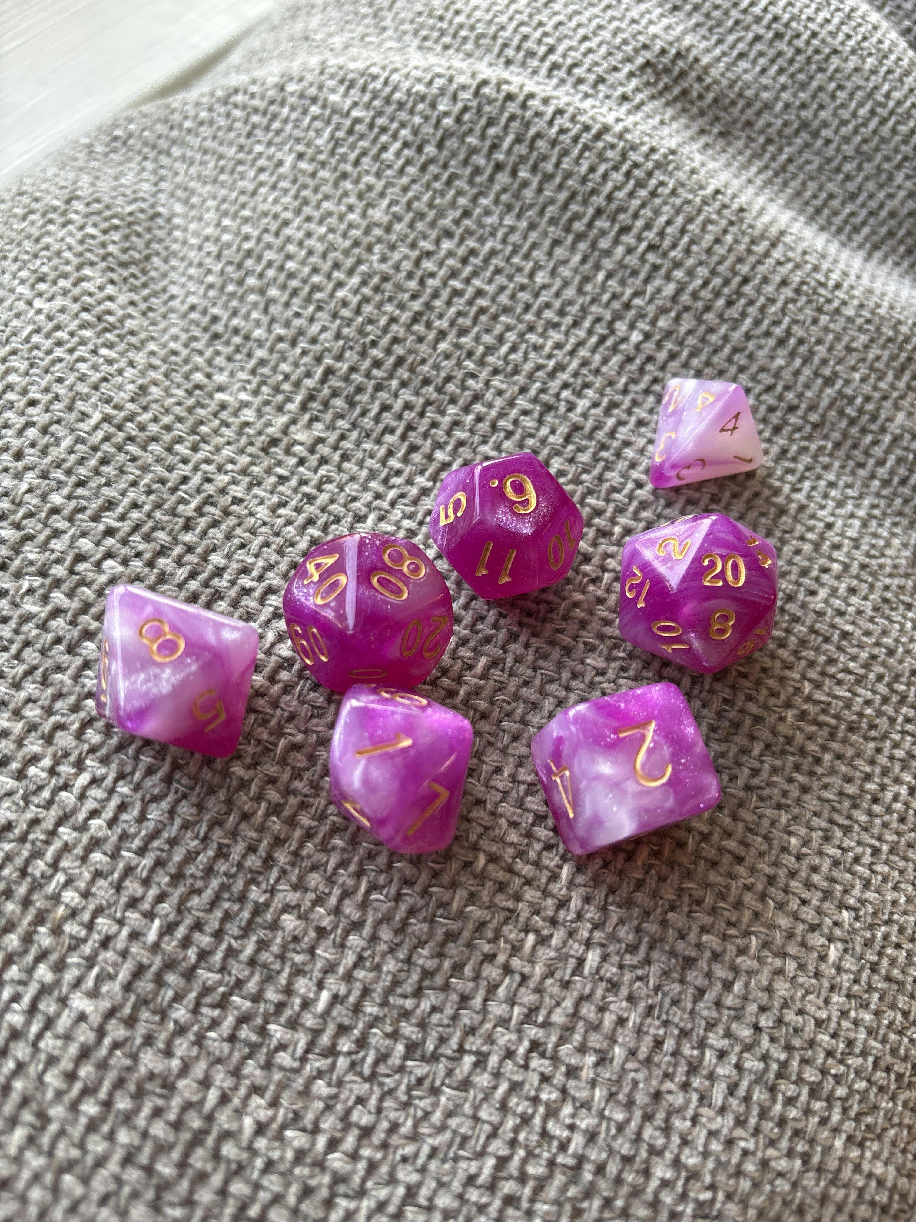 Bardic Love | Pink, Whie Swirled, Glittery Acrylic Dice Set (7) | TTRPG Dnd Polyhedral Set