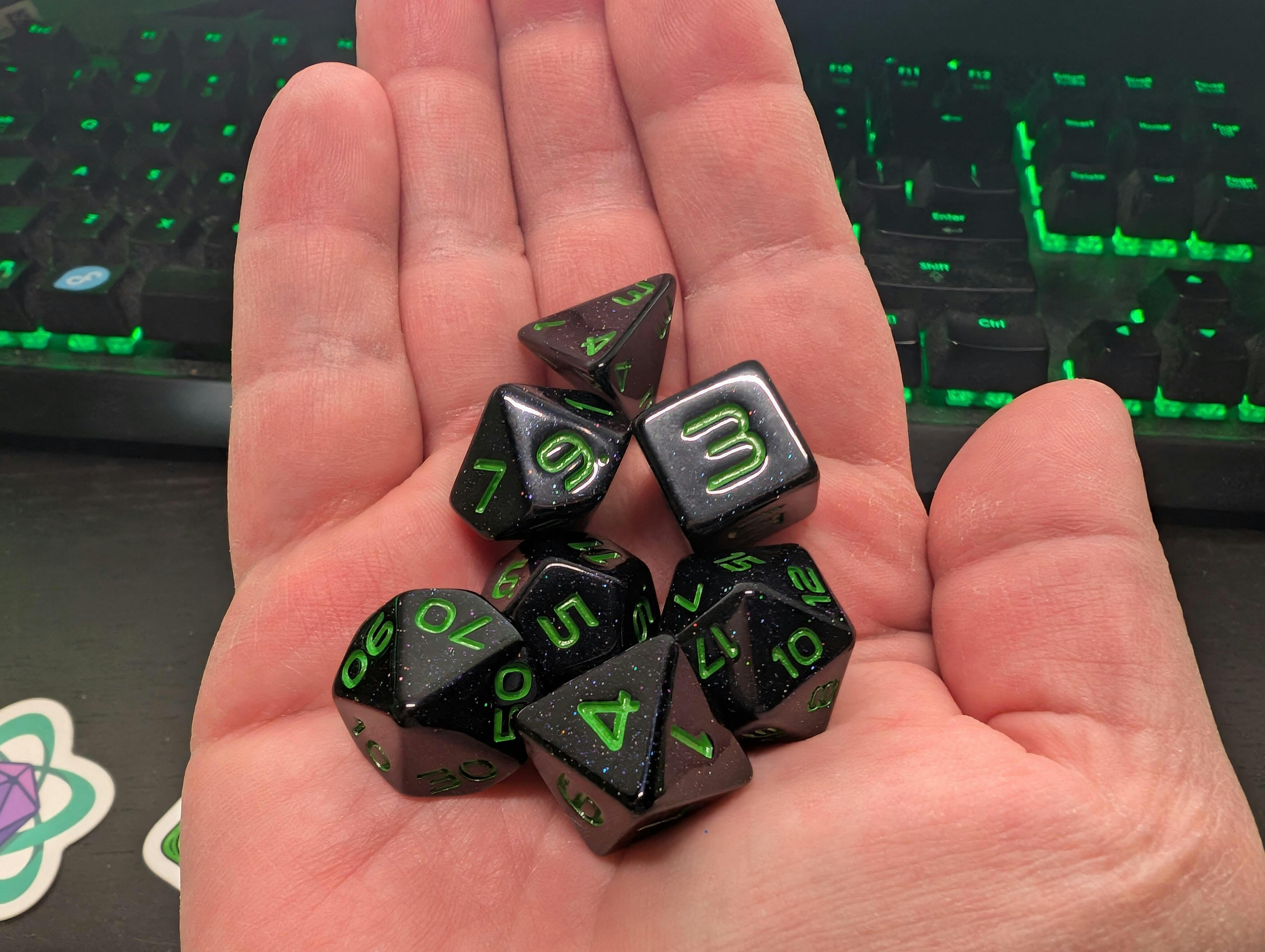 We photograph our dice to be true-to-life (balanced close to daylight around 5600K). We try not to “overglam” our photos, and we do our best to show what you’ll actually receive. That said, screens and lighting can wildly change how colors look. If your dice seem radically different, the quickest reality-check is to view them in natural daylight (near a window or outside), and compare again.