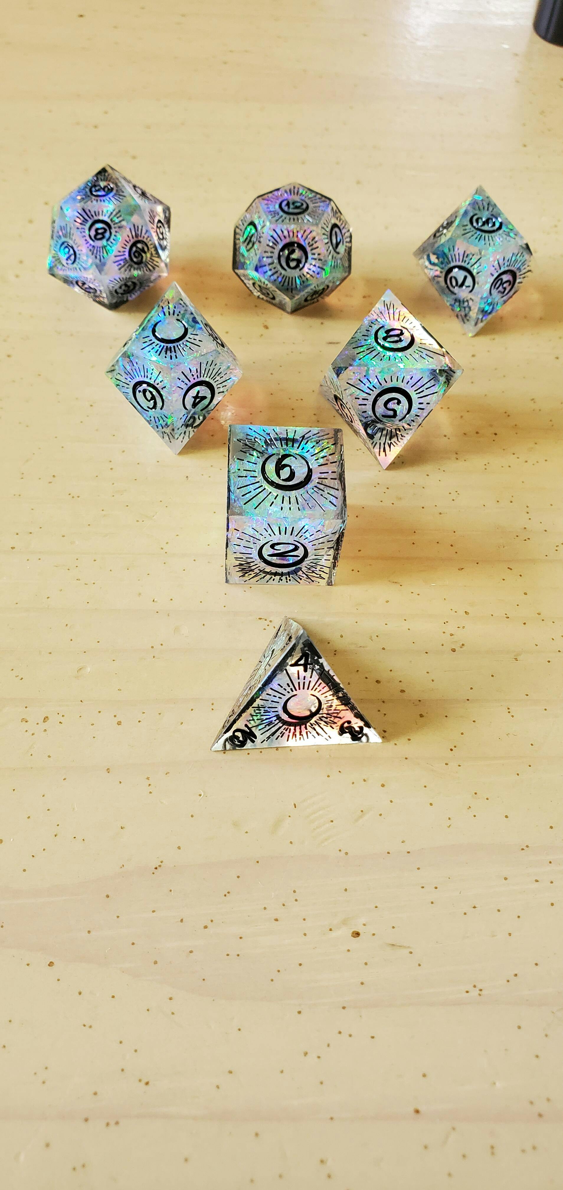 Colors/Style: Translucent Clear Dice with Blue-Green Holographic Film Inside, Moon Designs, Black Ink, Sharp Edged